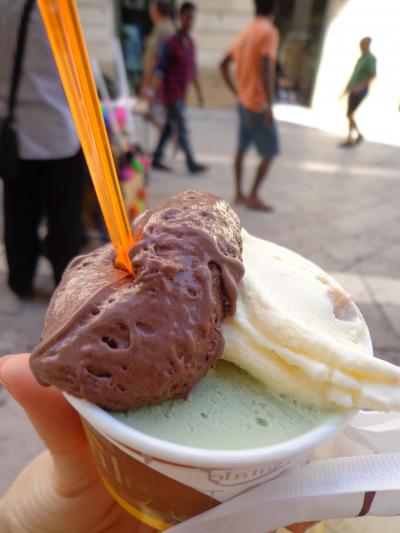夜は混むみたいなので、午前中に行ってみました。空いていたのでゆっくり品定め。中の大きさのカップで3つの味が楽しめます。(2.5ユーロ)私は「ピスタチオ」「パスティチョット味」「チョコレート」と3つとも甘めのものを選んでしまいました。友達が食べた「バナナ」も濃厚で美味しかったです。友達は「ピスタチオ」「バナナ」「ヨーグルト」とバランスのよい組み合わせでした。最初に頼むものが多めになるので、好きな味から頼むなど、少し考えた方がいいかもしれないです。