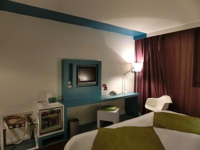 現代的なビル形式のホテルです、部屋もちょっと面白い色使いで少しポップな感じ、