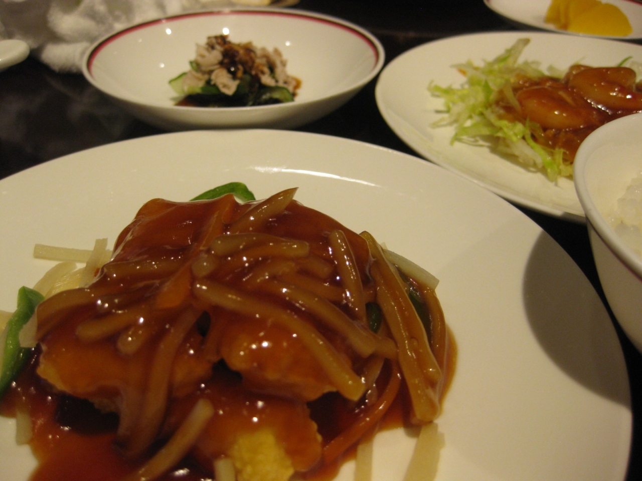 前菜、スープ、メイン(白身魚の甘酢あんかけ)、点心、ご飯、デザートのコースです。