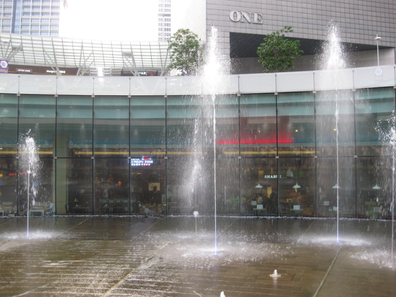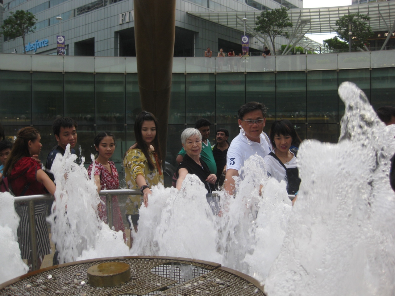 噴水の周りを人が囲み、片手で噴水の水に触れ、何やら騒いでいました。