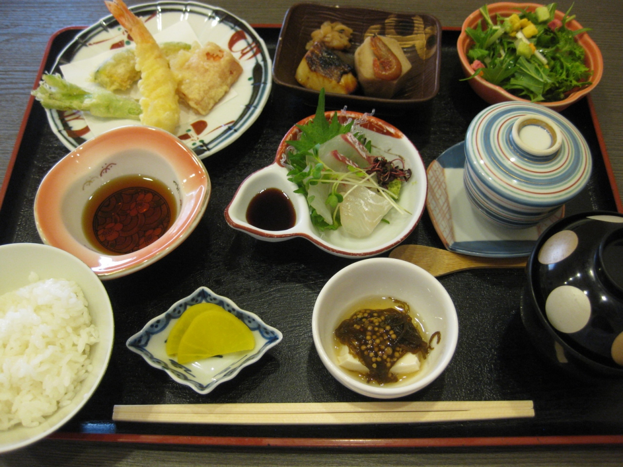 鯛の刺身、天ぷら、煮物、茶碗蒸しといった、和食屋定番の料理。