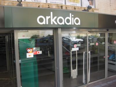 黒い看板に白抜きの文字で「arcadia」と書いています。