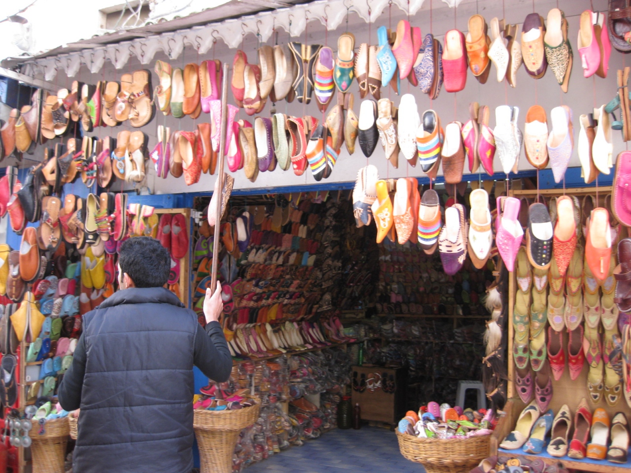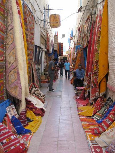 細い路地に、絨毯やバブーシュ、寄木細工などのモロッコの工芸品のお店がひしめき合っています。