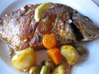 料理は、サラダ、鯛のような魚をグリルしたもの、アップルタルトでした。