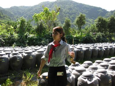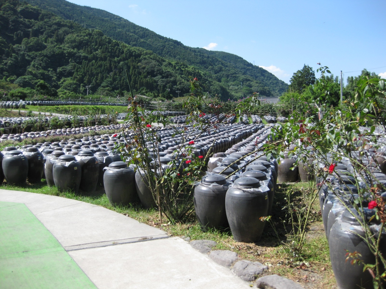 広い庭には、黒酢を熟成させている壺がたくさん並べられていて、