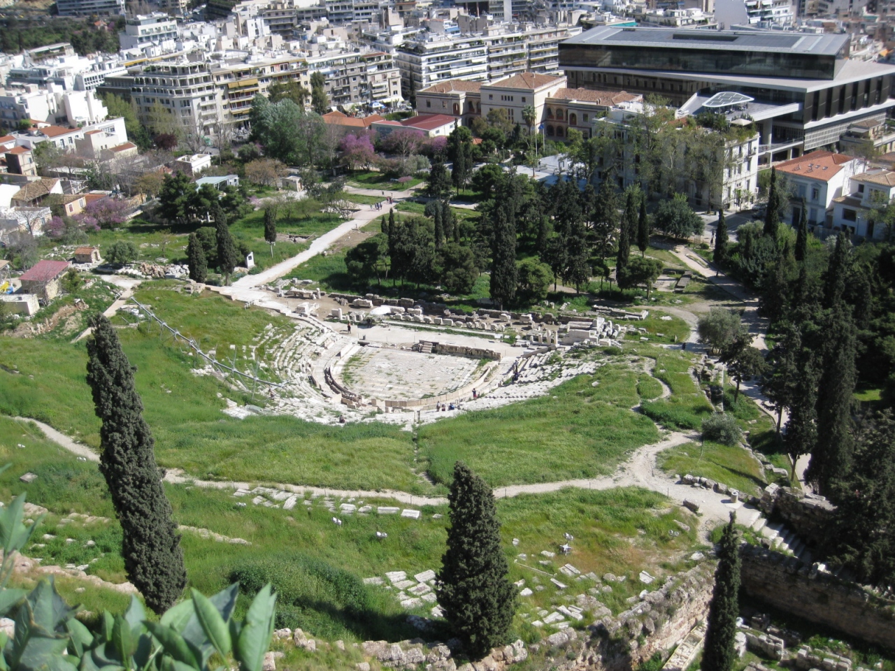 ヘロド・アティクス音楽堂はパルテノン神殿に向かって右下にあります。