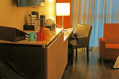 大変大きくスタイリッシュなホテルです。部屋からは空港の駐車場が見れました。部屋自体はあまり広いとは言えず帰りの荷物整理には少し不便、そしてアサインされた部屋はシャワーのみ。この点は原点かな?