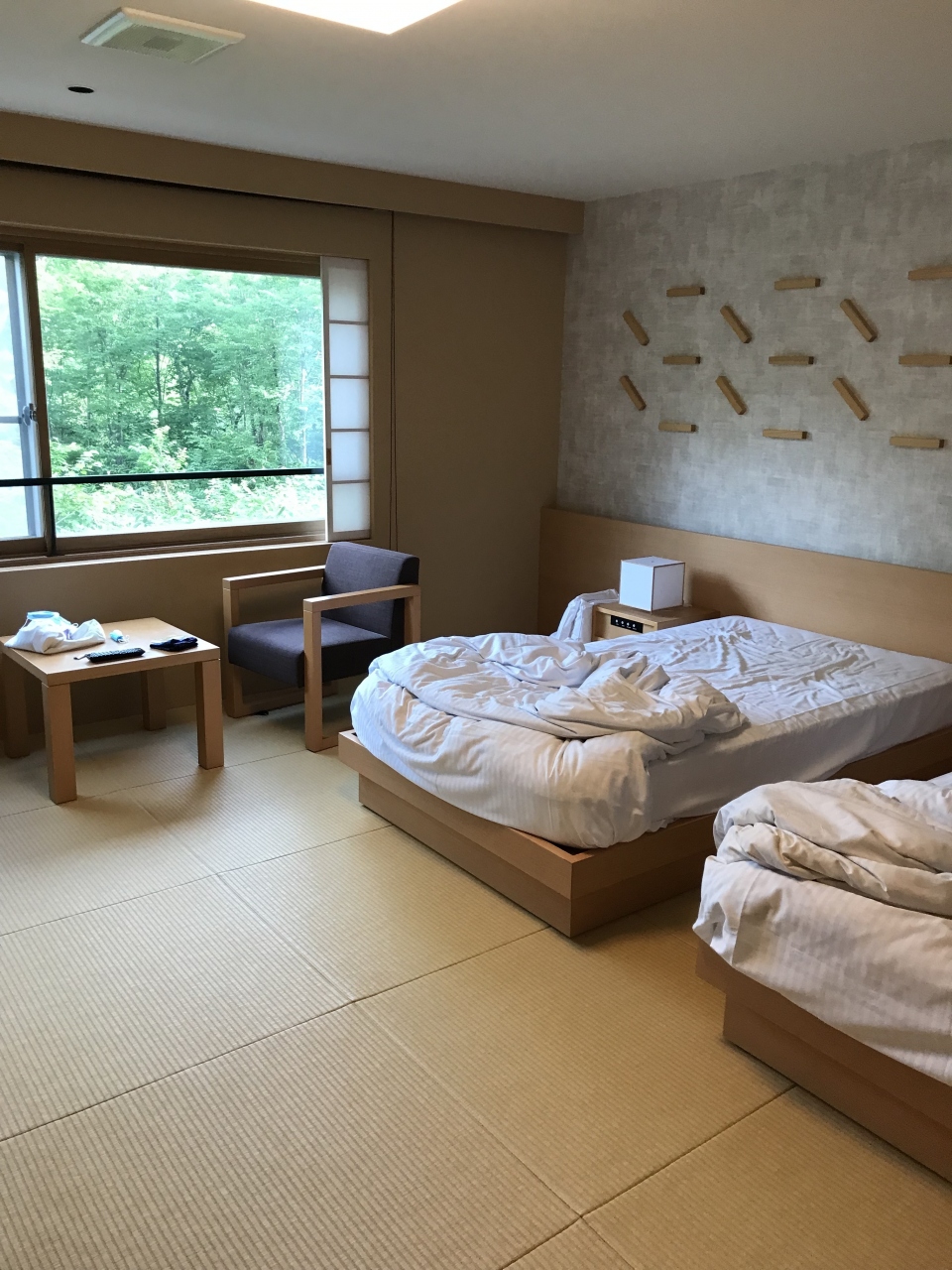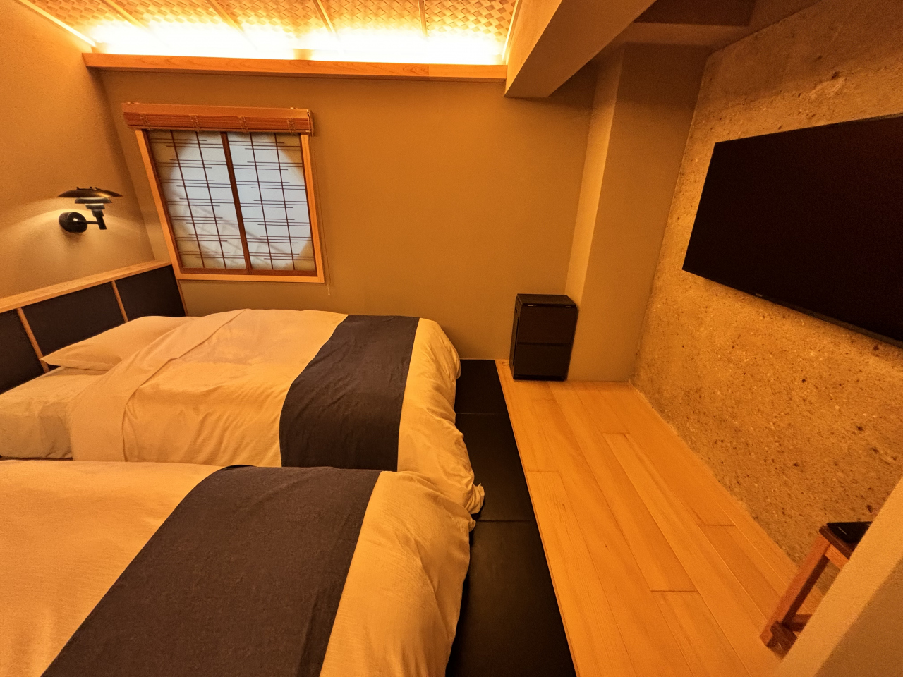難を言えばこの部屋は4人眠るには少し狭く感じます。空きがなかったので2部屋取れず一番広い部屋も取れず、、これは直前予約では致し方の無い事ですが、、