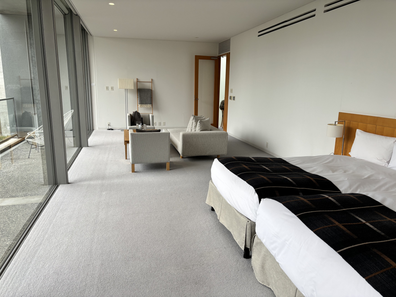 ホテルは安藤忠雄らしいコンクリートの打ちっぱなしの建物です。しかしそこには冷たさも硬さも感じられない不思議な空間がありました。