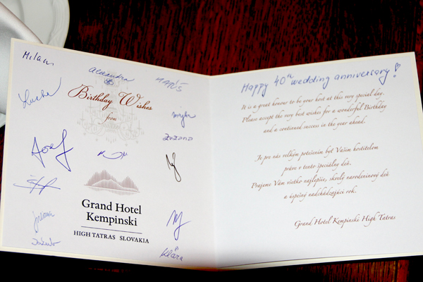 部屋に入るとテーブルにスロバキアのワイン、果物盛り合わせ、そして、従業員全員のサインの書かれたお祝いメッセージカードが置かれてありました。