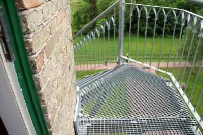 部屋へ行くにはタワーの外にある金属製の網の階段を90段ほど登った先、4階部分に入り口があります。