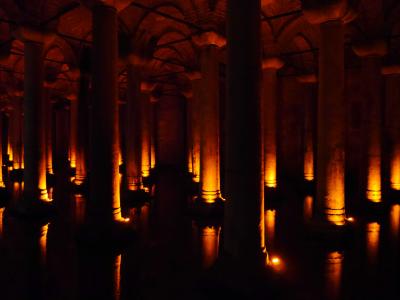 アヤソフィアを見学し、まだ夕暮れには時間があったので、とても近い距離にある地下宮殿に向かいました。漆黒の水面に浮かぶイスラム様式の柱、ライトに当てられてとても神秘的に感じられました。地上の喧騒の中からやって来て、多くの観光客がいるにも関わらず、静寂な雰囲気に感激しました。でも、なにやら沢山の魚にギョッとしました!