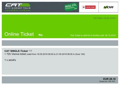 空港から市内に向かうCATの片道切符、そして72時間のVienna Ticketをインターネットより購入しました。一人28.1ユーロと決してお安くはないのですが、到着初日ですので何せ切符を買う煩わしさもなく、検札があれば、プリントアウトした切符を見せるだけで済みますので、とても便利でした。