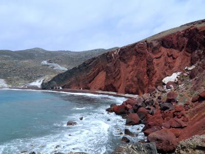 途中、教会のある駐車場を過ぎ、登り切ったところがレッドビーチを見下ろせる高台になっています。この日は晴れてはいたのですが、ちょうど高台についたころから曇りがちになり、風も若干強くなり、青い海の空に挟まれた赤い海岸というスティエーションは見事にくずれました。どんよりとした海、鉛色の空そして決して赤とはいえない海岸線となってしまいました。ここからレッドビーチへと下れるみたいですが、気力を使い果たし、帰路に着きました。- 旅行時期