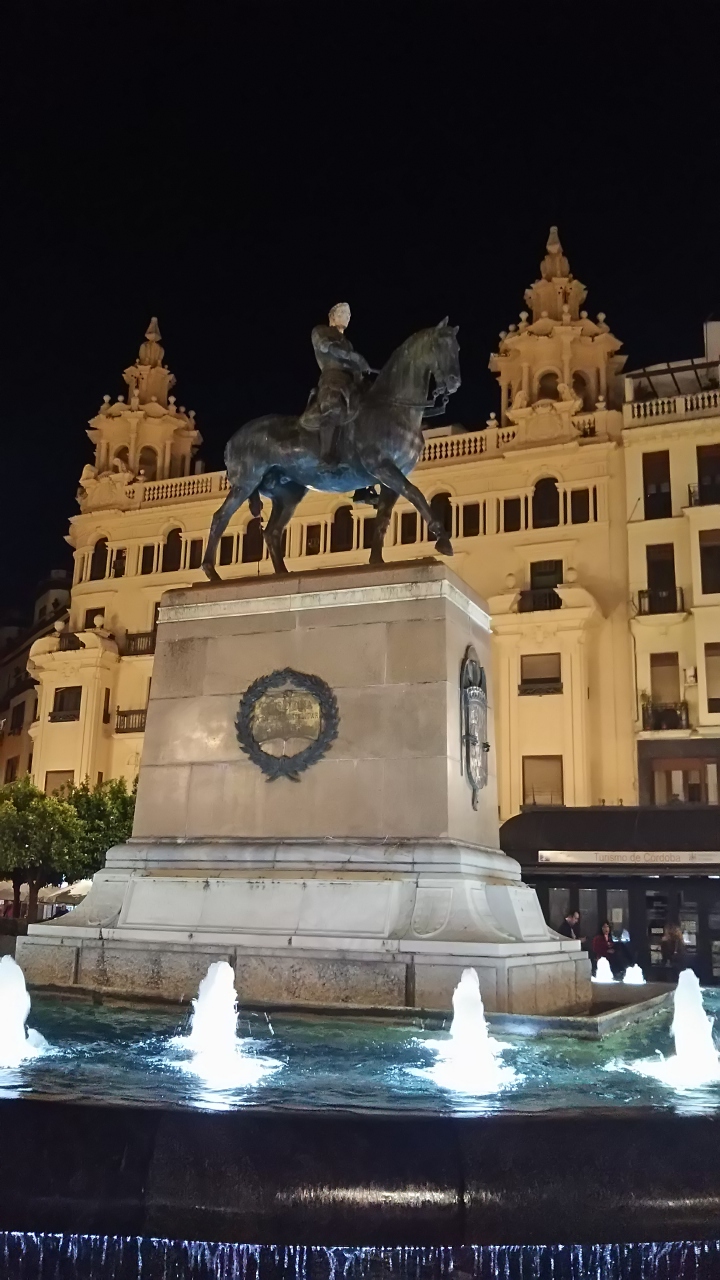 ここの広場、パティオ巡りの帰り道、通りかかった広場で、ライトアップされた騎馬の像がとても印象的でした。