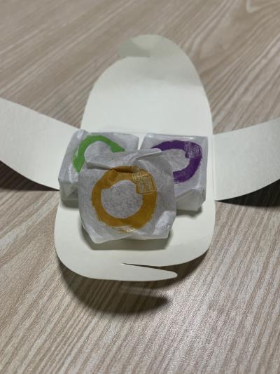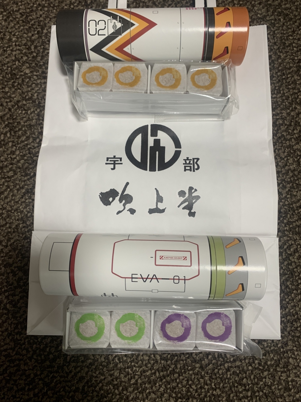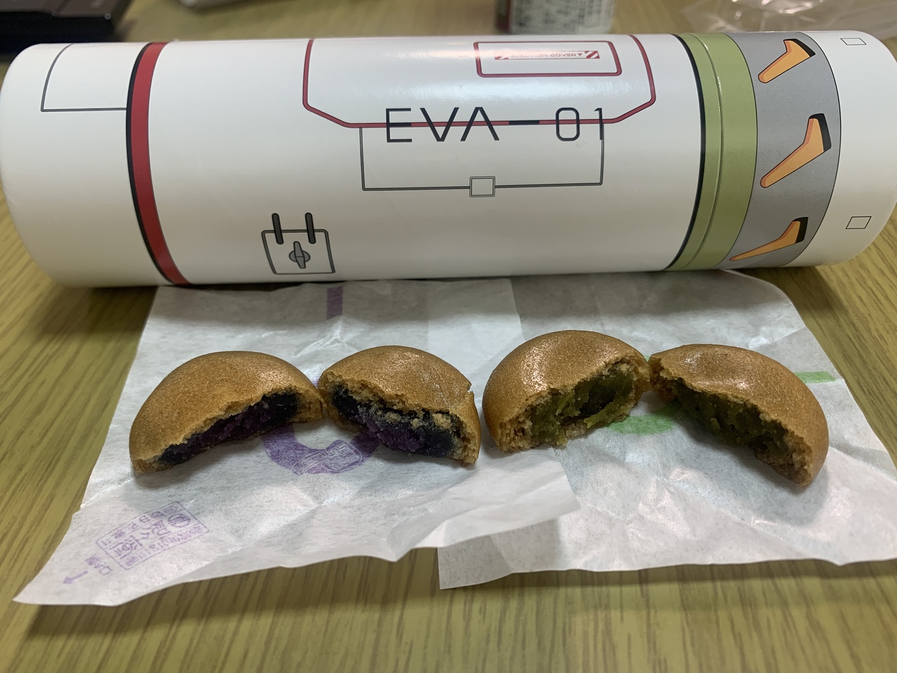 宇部市のまちじゅうエヴァンゲリオンの企画でエヴァンゲリオンコラボダグワーズが販売されています。購入するとエヴァンゲリオンのコースターがもらえましたが、8月末現在はコースターがなくなり、ランチョンマットがもらえるらしいです。見た目はわかりにくいですが、断面は鮮やかな色です。味も美味しいです。