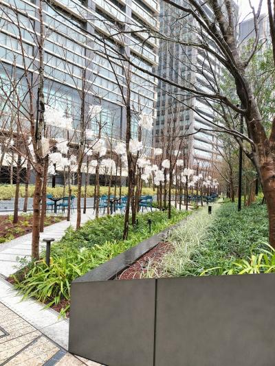 OTEMACHI ONEビルにあるガーデンです。花や木々があり椅子もおかれています。オフィス街にあるオアシス的な場所のようです。私が訪れた時は雨の日曜日だったので、誰も利用していませんでした。警備の方が巡回していたので、日頃でも安心して利用できそうな場所です。