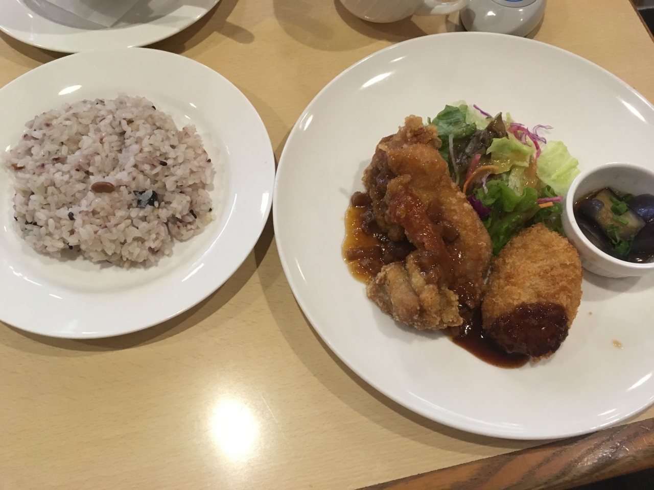 平日12時ちょうどぐらいに来店しました。待ち客はおらず、すぐに案内されました。日替わりランチセット690円とキッズうどん377円を注文しました。キッズうどんが具沢山のうどんなのですごいです。ご飯屋さんで子供用のうどんを注文しても、ワカメとかまぼこぐらいしかのってないのが普通なのに。人参、大根、鶏肉、卵など煮込んだ具材がたっぷりのっています。