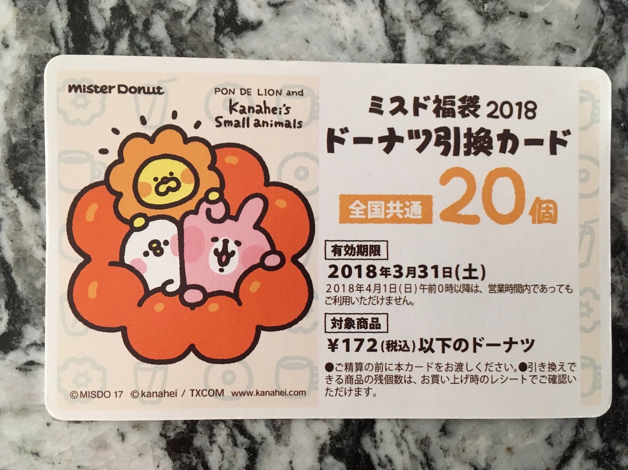 ミスタードーナツの福袋の販売初日に買いに行きました。大好きなカナヘイとのコラボ福袋だと知り初めてミスタードーナツの福袋を買いました。ドーナツ券だけでもお得なのに、おまけのカナヘイグッズがついてきて満足です。