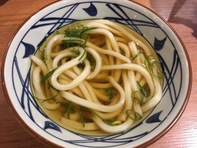 南砂町 ショッピングセンター「スナモ」のフードコートにある丸亀製麺です。一歳の子供にかけうどんと、かしわ天、かぼちゃ天を注文しました。かけうどんの温かいものに冷たい麺を入れてもらうと子供の食べやすい温度になります。