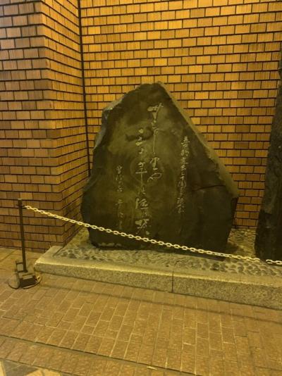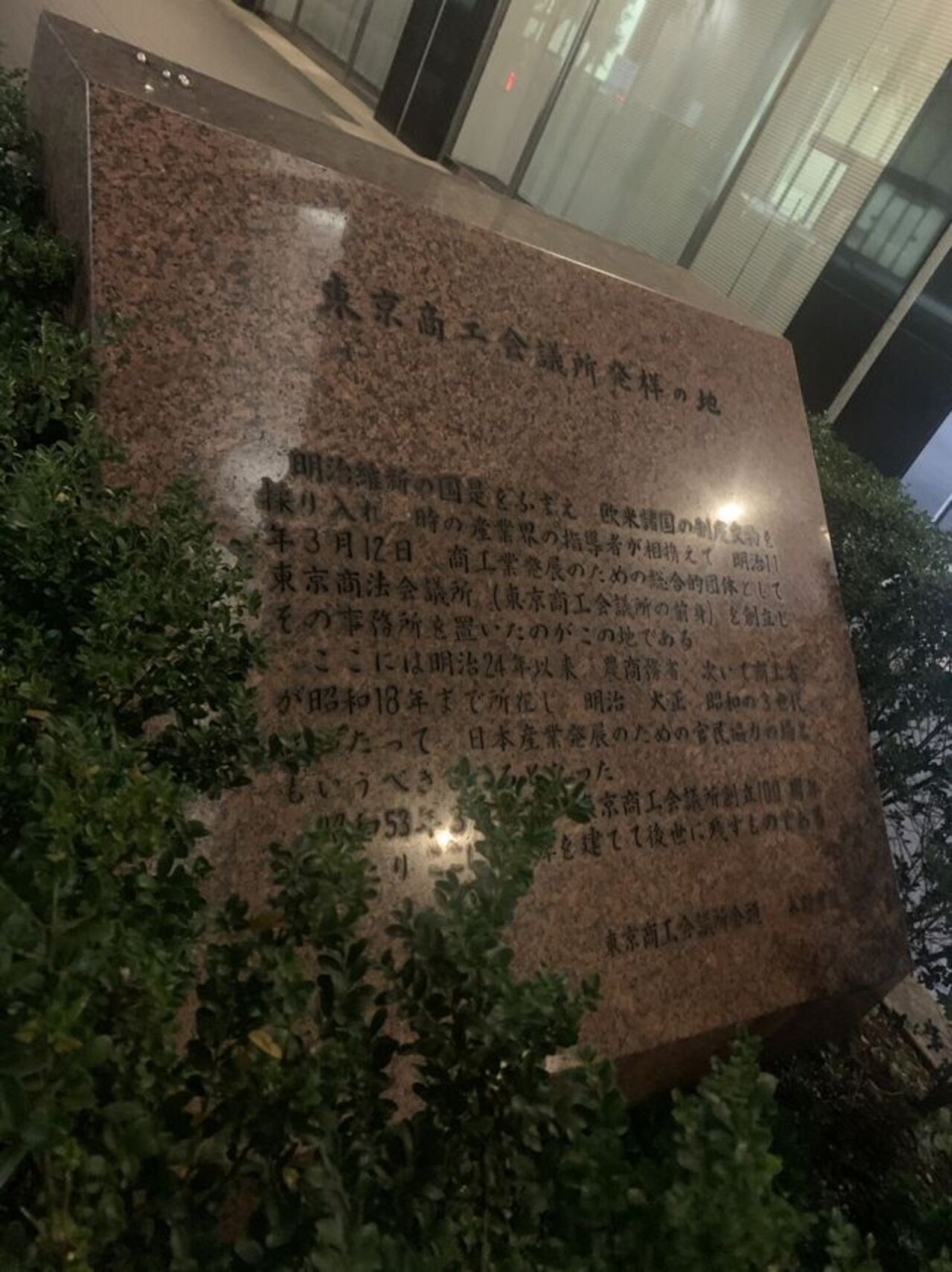 新橋演舞場を訪れる際に訪れました。目立つものがあるのではなく石碑がありました。夜に訪れたのもあるのですが、正直目立たなすぎて、けっこう探しました。歩道の植え込みに埋まっています。石碑がある場所に「東京商法会議所」が設立されました。「東京商法会議所」が設立されました。初代会頭は 渋澤榮一です。