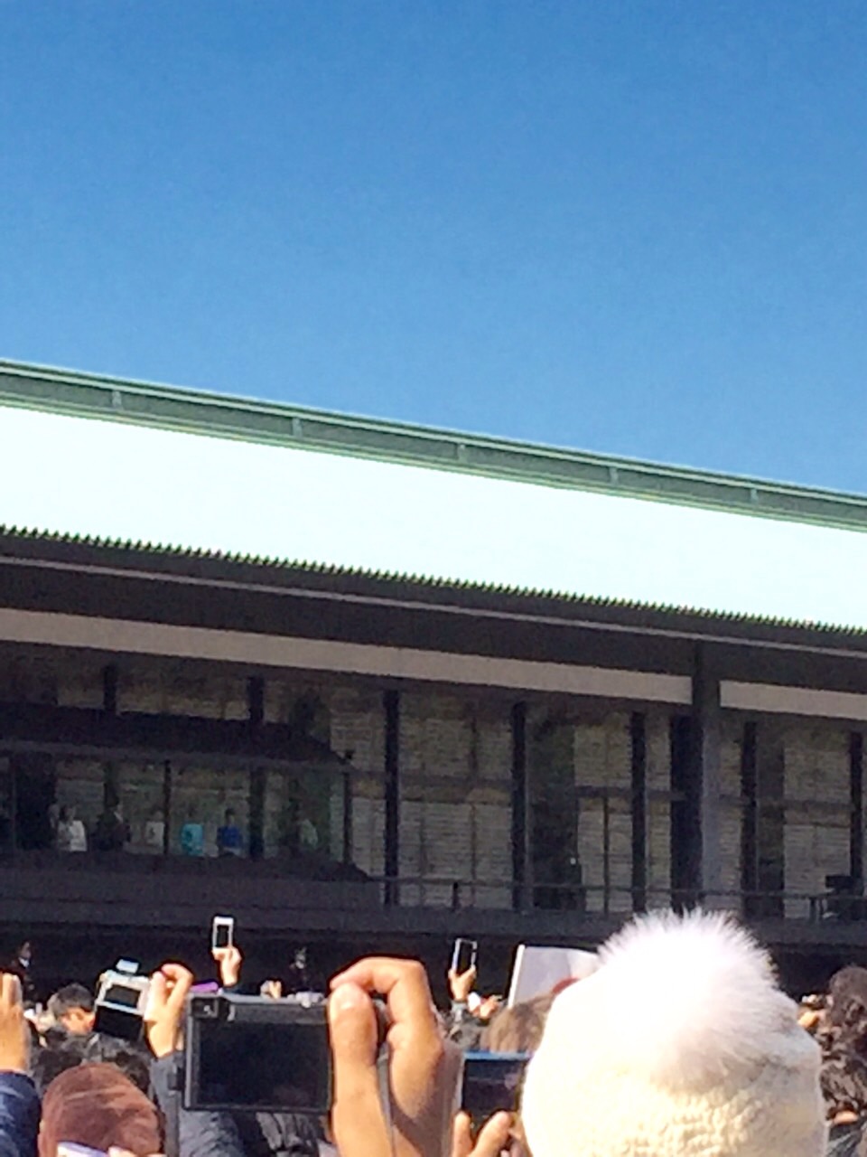 とにかく人が多いです。行列に並んで待って、やっとたどりついて、また待って。トイレも行けないし、飲食禁止、座り込んでもダメなので我慢です。天皇家の皆様が出てこられても遠くで小さく見えただけでした。お声を聞いて、雰囲気を味わえたので良しとします。