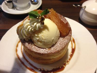 スフレパンケーキは安定して美味しいです。写真は期間限定のスフレパンケーキです。季節によって限定のスフレパンケーキが存在します。カフェインが入っていないコーヒーもあるので妊娠時に来店しても安心です。しかもノンカフェインコーヒーが美味しいです。