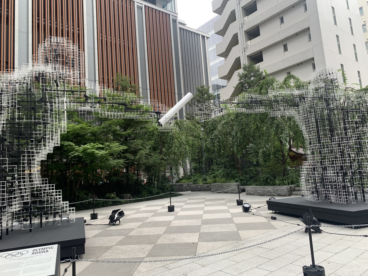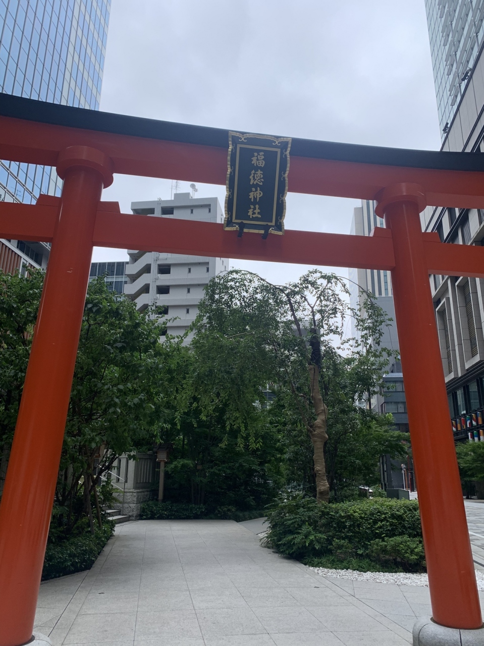 福徳神社は古くから近隣の住民や徳川歴代将軍からも信仰を集めていて、商売繁盛や勝負事、宝くじ当選祈願などのご利益がある神社だそうです。福徳の森といわれる広場にはオリンピックのオブジェが飾ってありました。木々や花もありビルだらけの周囲と一風変わった空間です。