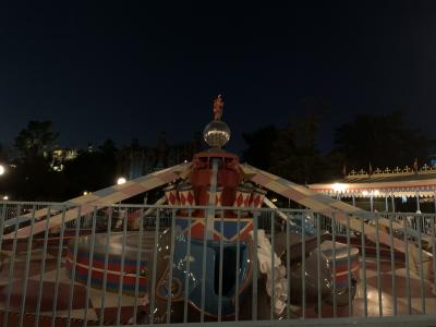 ファンタジーランドにあるアトラクションです。ダンボの背中に乗って空の旅ができます。レバーを操作して自由にライドの高度を上下させることができるのも楽しいです。今回は陽が落ちてから乗ったので、昼間とは違う雰囲気で楽しめました。