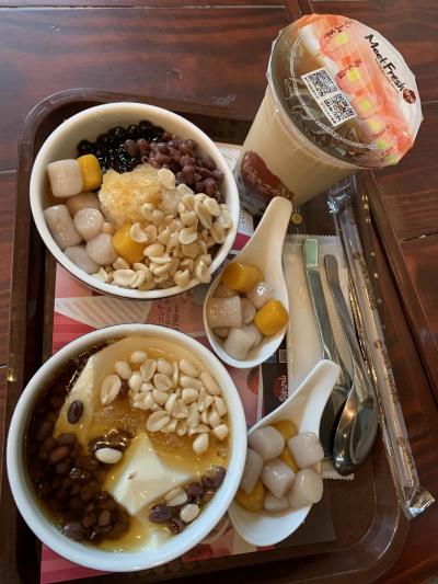 芋園、仙草、豆花・・・台湾のデザートが食べられるお店です。4歳の子供はちょっと苦手らしく、子供はタピオカミルクティを飲みました。私は豆花、夫は芋園を食べました。旧正月のお祝いの期間だったらしく芋園のトッピングが無料でした。夫は芋園ダブルになってしまい、知ってたら他のメニューにしたのにと言ってましたが、しょうがありません。仙草も食べたかったので、仙草はテイクアウトして家で食べました。Mサイズでもけっこうな量があり、満足できます。