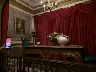 抽選で当たらないと体験できないのですが、無事当選することができました。スタンバイ中も、ポット夫人とチップかおしゃべりしていたり、椅子のような犬がワンワン吠えていたりと楽しめる仕掛けがあるのですが、抽選した人しか入場しないので、サクサク歩かさせられてゆっくり見させてもらえません。大きなカップに乗り込んで美女と野獣の世界を体験しました。