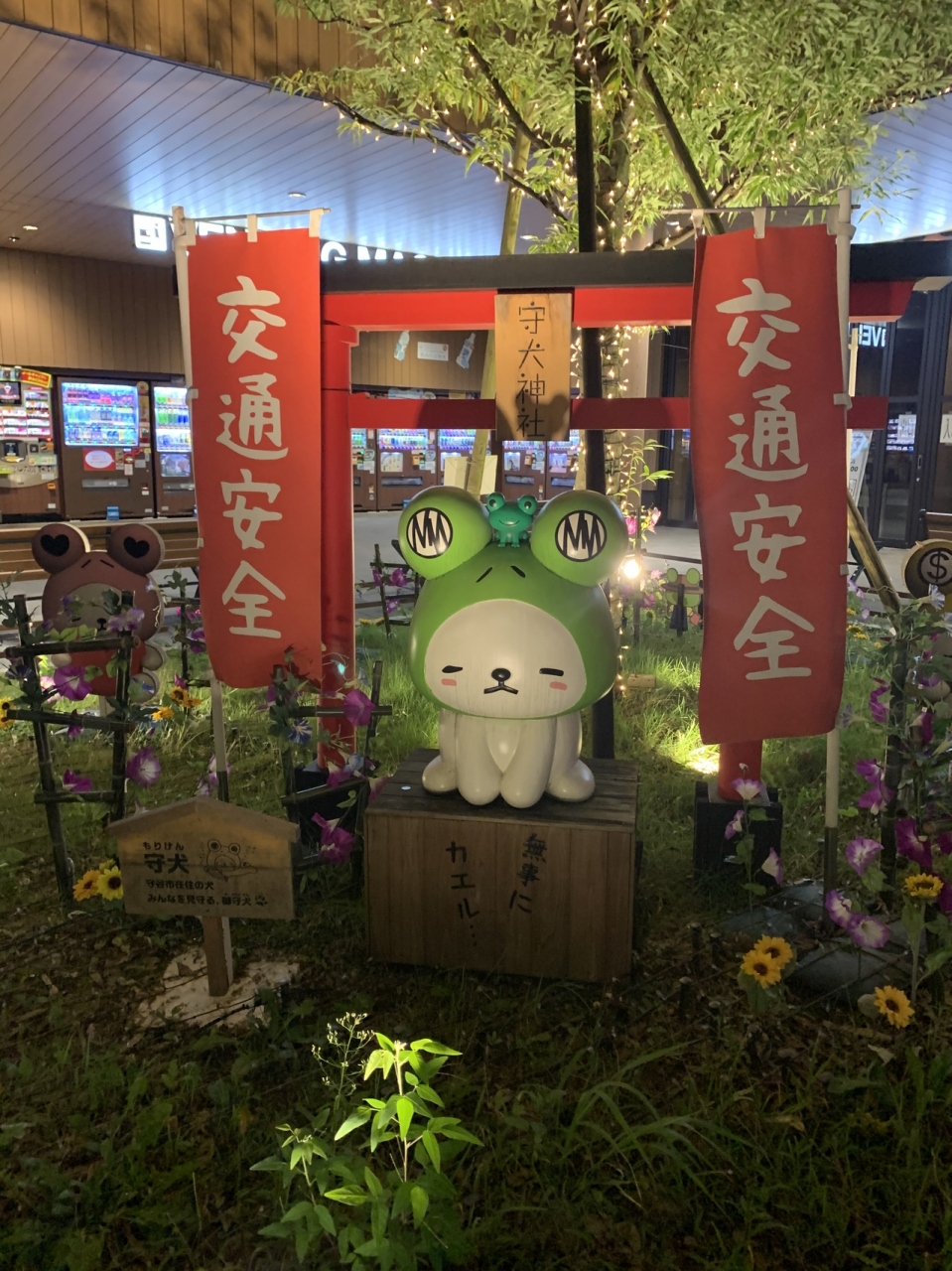「恵みの森」をコンセプトにしたサービスエリアだそうです。「守犬」というキャラクターがいて神社があります。「無事カエル」ことをお願いしました。1人焼肉で有名な「ライク」があり食べてみたかったけれど子供に却下されてしまいました。フードコートは日が暮れると柱がライトアップされいろいろな色に変わります。