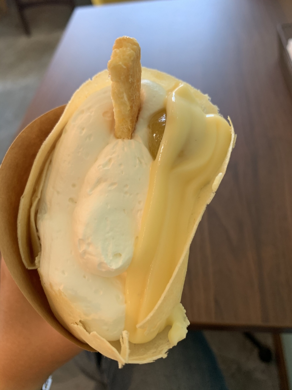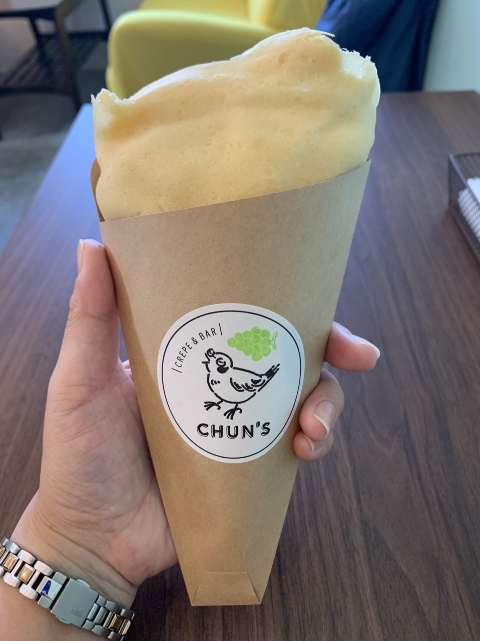 Twitterでみかけた9月限定の「マスカットカスタパイ」クレープが美味しそうだったので訪れました。濃厚カスタードとさっぱしたマスカットの相性がばっちり。小さめなパイのかけらも挟んでありケーキを食べてる感覚にもなりました。ボリュームがあるのでお腹いっぱいになりました。