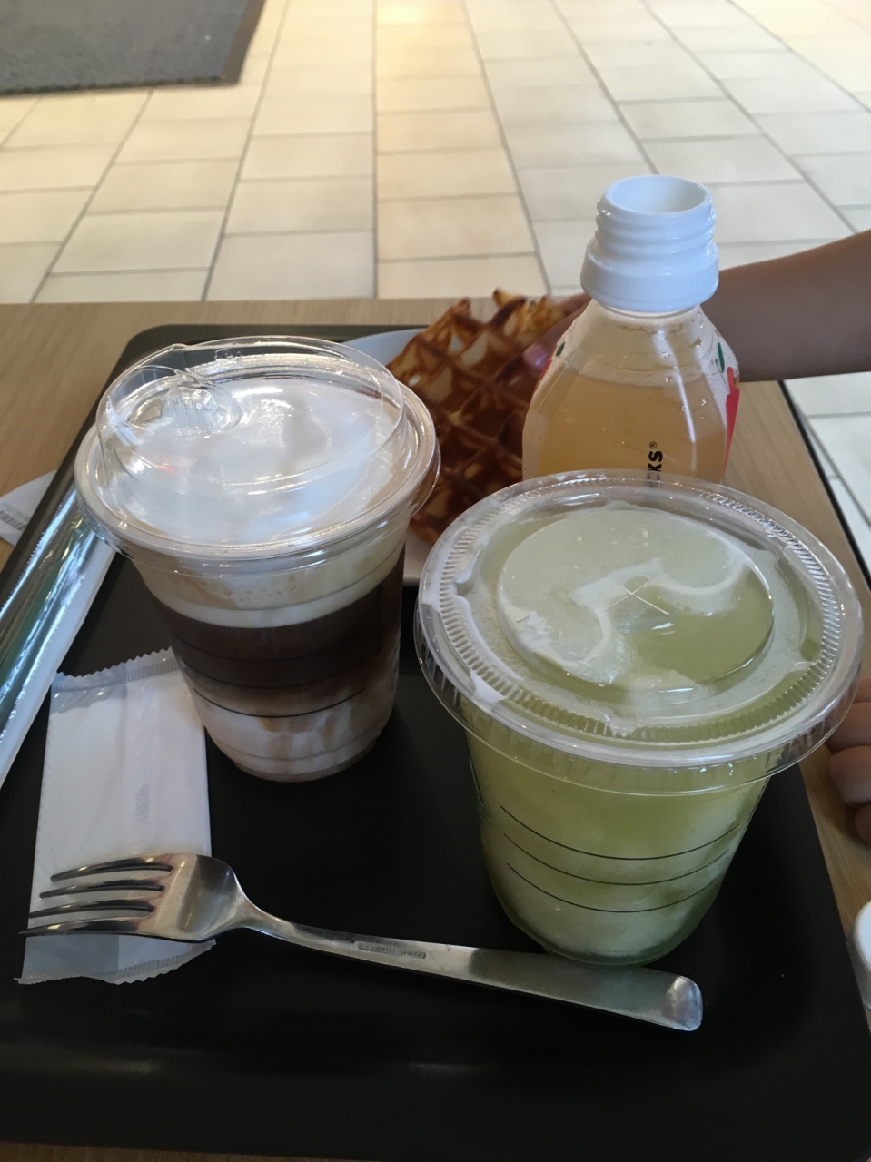 ららぽーと新三郷で休憩をしたくてこちらに来店しました。夫はアイスムースフォームラテ、子供はリンゴジュース、私は期間限定のティバーナフローズンティー香る煎茶×グリーン アップルにしました。煎茶とリンゴの組み合わせがとても、甘みがあるのにサッパリ爽やかで美味しかったです。