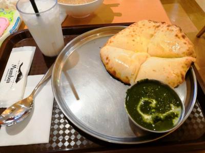 越谷レイクタウンのフードコートにあるインドカレー屋です。ナンがとても大きかったり、ナン食べ放題だったりするお店があるので、チーズナン、ほうれん草カレー、ラッシーで950円。ナンが小さいような気がします。