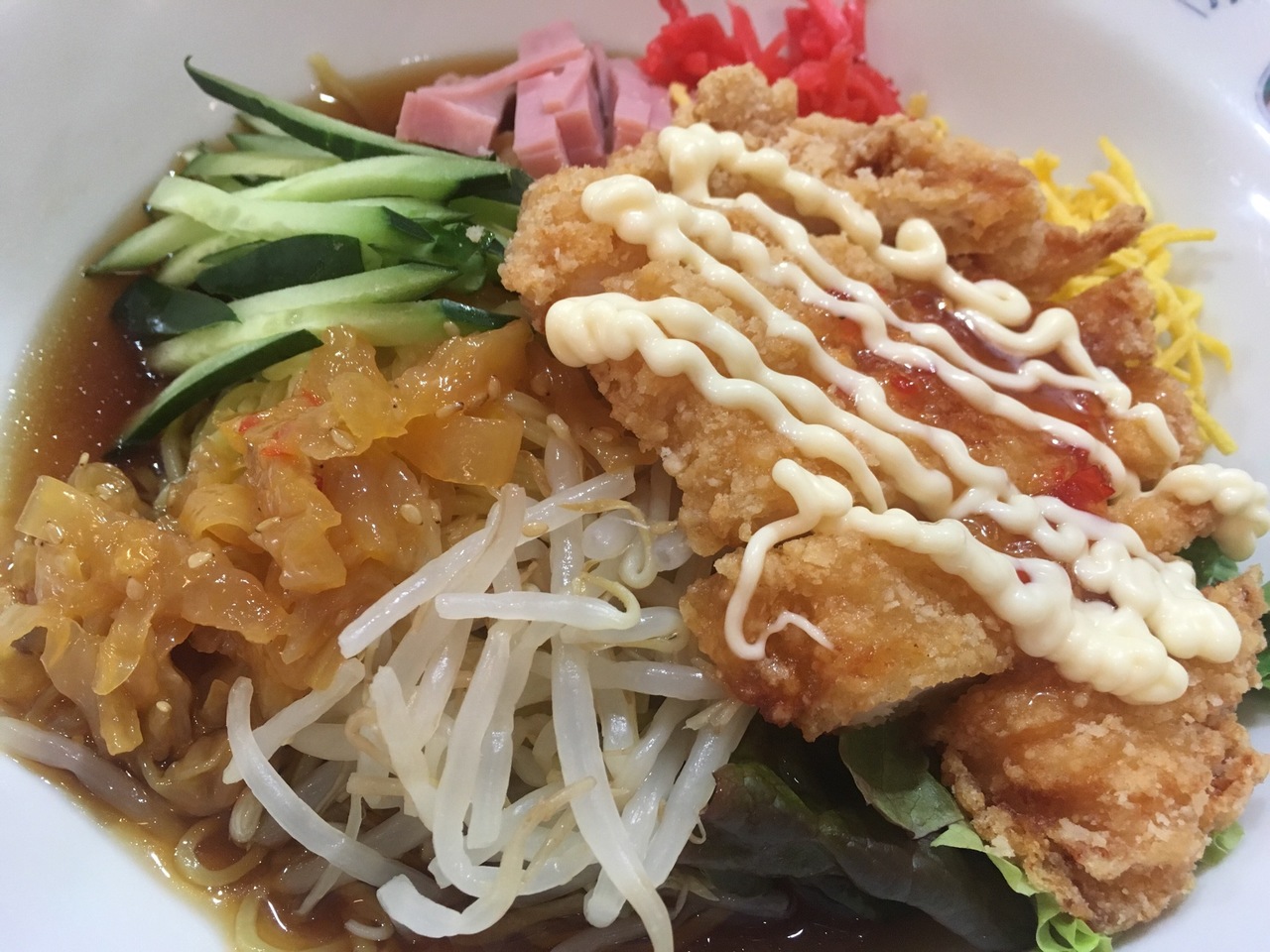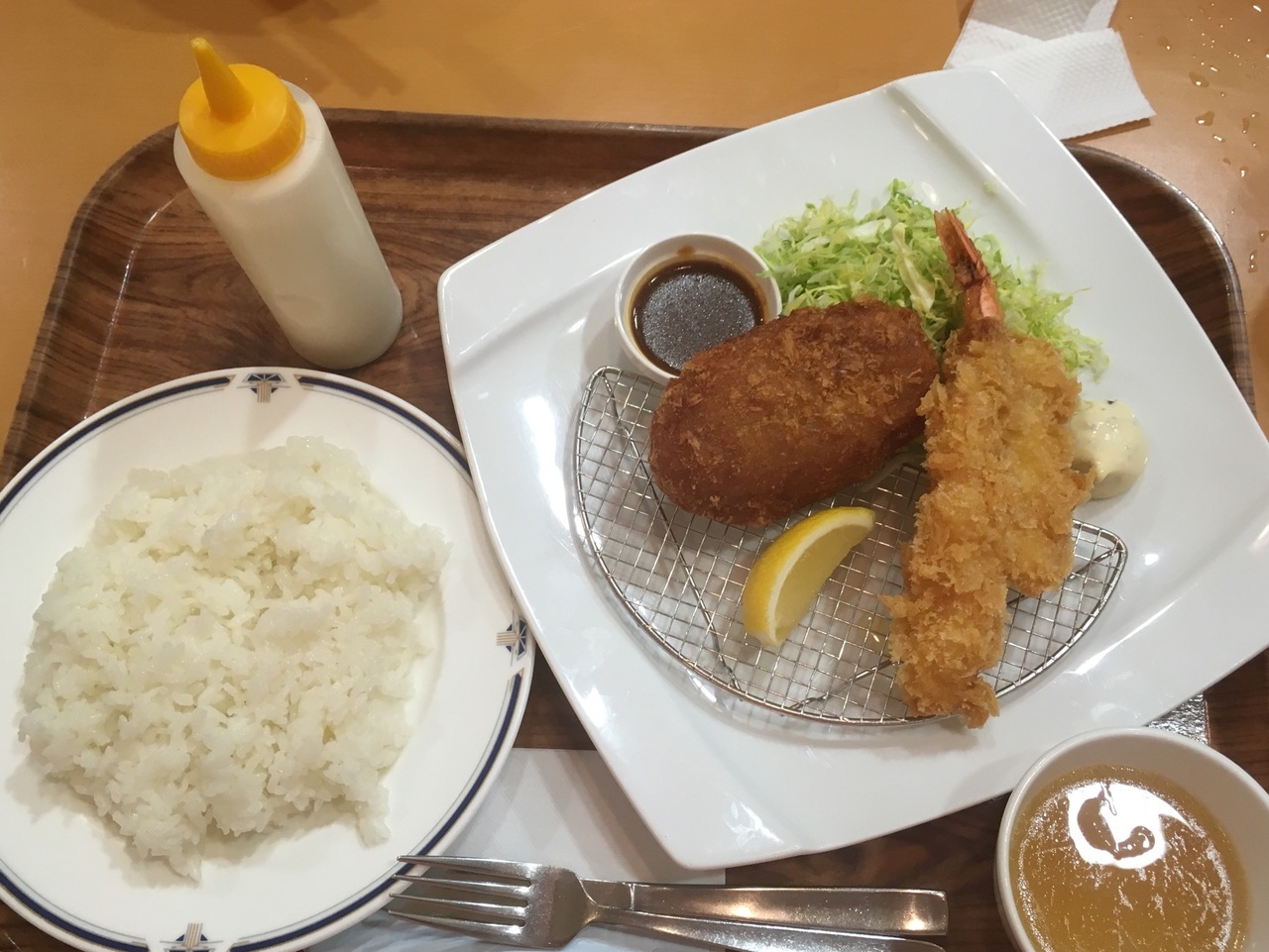 フードコートが少し混み合っていたのでレストランのほうにしました。夫は冷やし中華、私はフライ定食、子供はラーメンにしました。私のエビフライはとても大きくて食べ応えがありました。ラーメンはちょっと食べさせてもらったら魚介系のスープのラーメンでした。