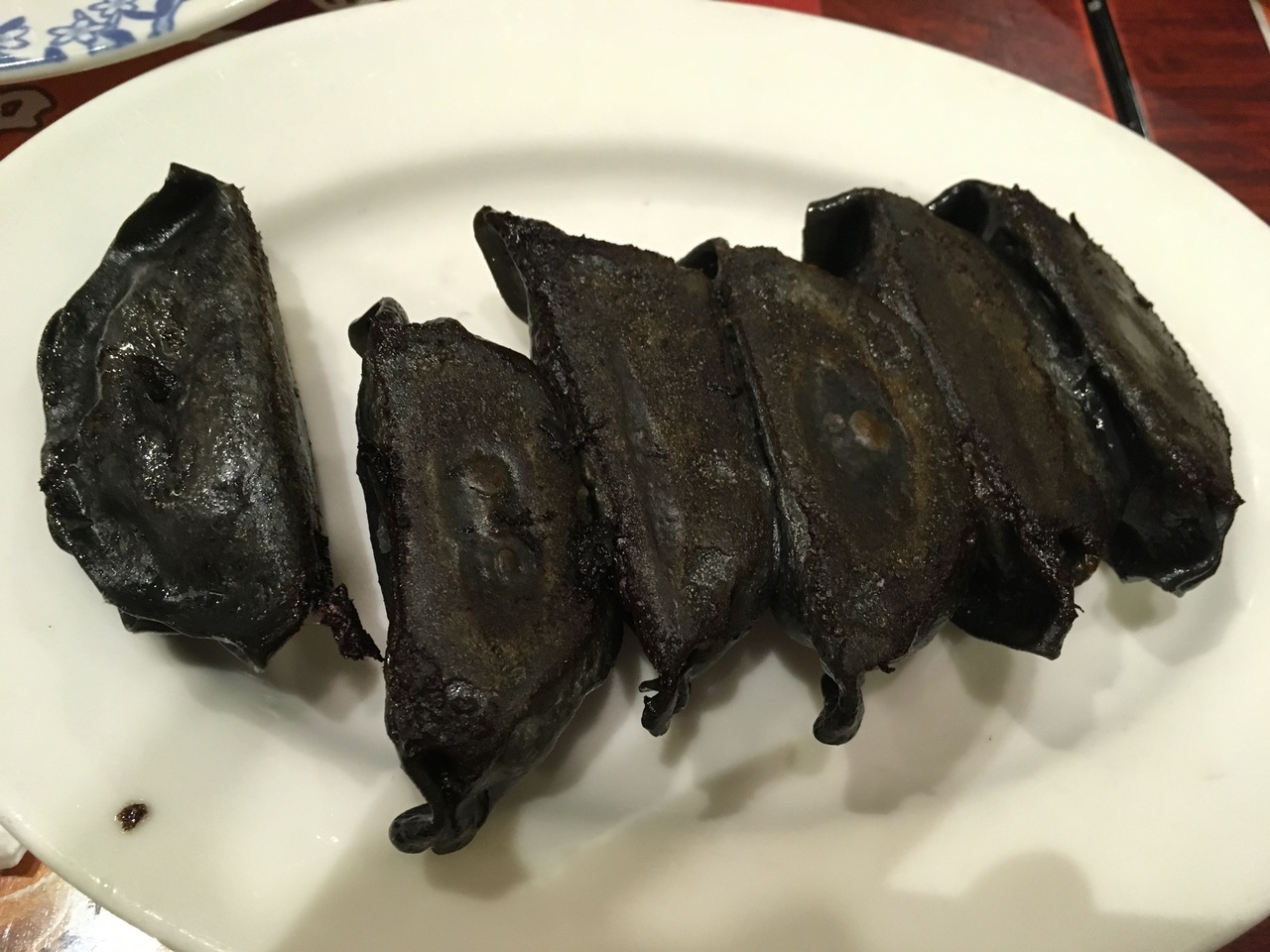 バーミヤンラーメンと期間限定⁈の黒い餃子を注文しました。黒い餃子は写真を見ただけで、説明文をよく読まないままに注文して、辛くてびっくり。胡椒がものすごく入ってます。竹炭が練りこんで皮が黒くしてあります。
