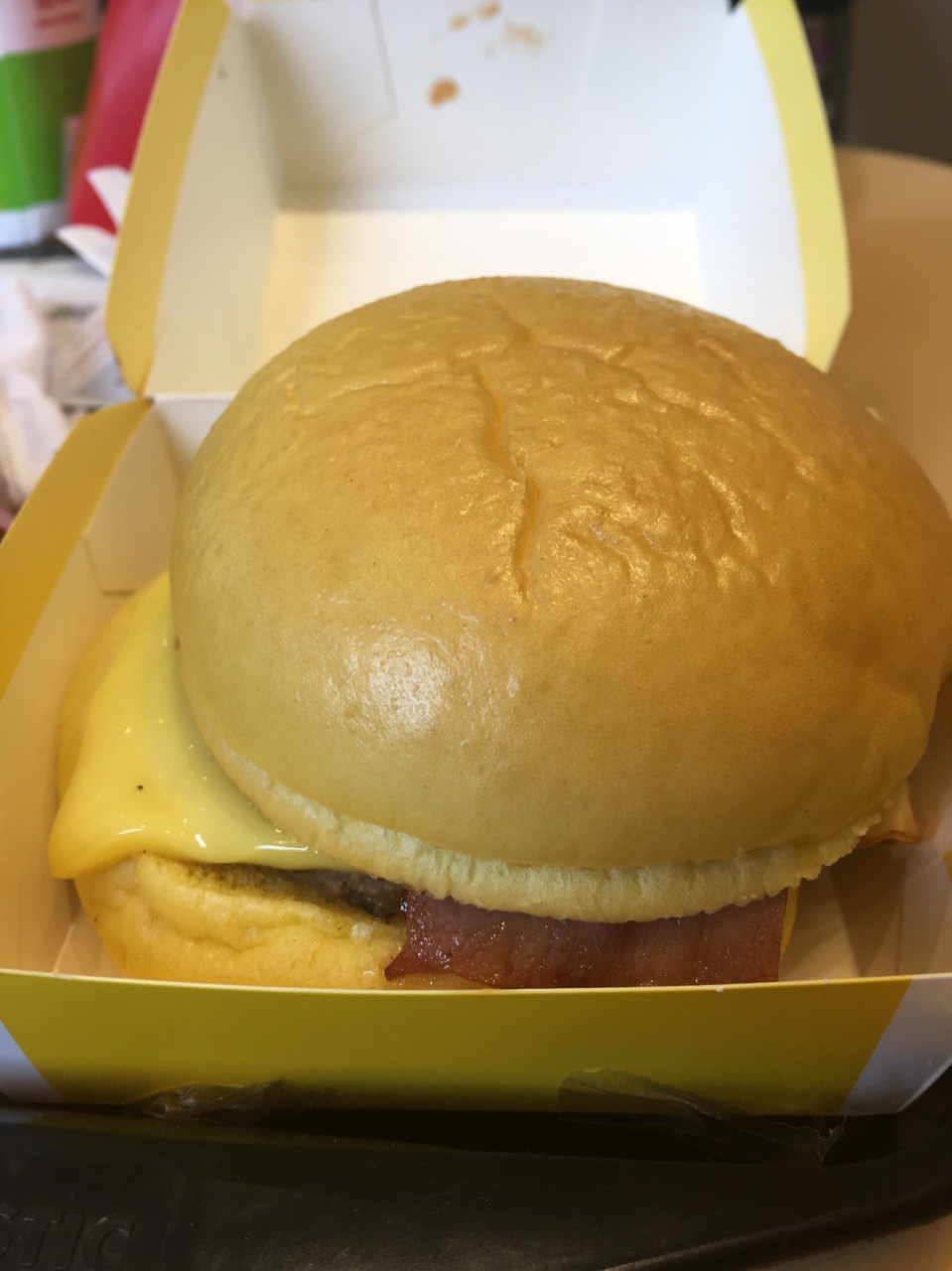 金の月見バーガーが食べたくて訪れました。パンズが美味しくてびっくり!バターたっぷり。パンズが美味しかったらしく、子供がパンズだけ欲しがりました。スモークベーコンと卵との組み合わせもバッチリ。マックフィズ巨峰も美味しかったです。
