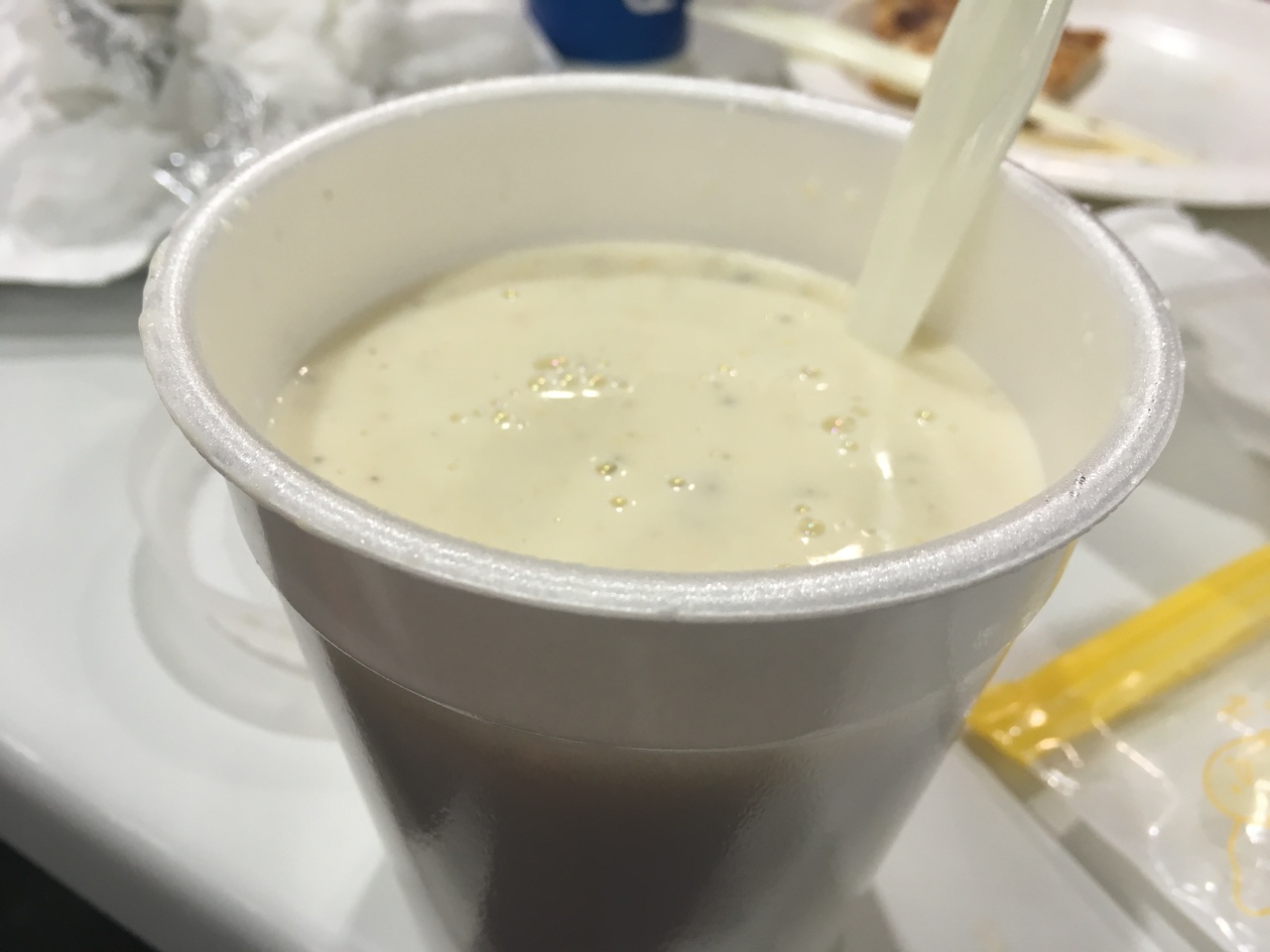 いつも食事コーナーでホットドッグかピザしか食べたことがなかったのですが、初めてクラムチャウダーを食べてみたら、とても美味しい!300円で具材たっぷり入った美味しいスープが食べられるなんて思いませんでした。