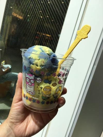 ららぽーとエキスポシティにあるサーティワンです。お店内には、席が数席しかありませんが、お店近くの通路に長椅子やソファーが多数あるので、そちらで買ったアイスを食べることができます。バナナ&パイナップルアイスクリームにブルーソーダソルべを組み合わせた、ミニオンカラーのアイス「Boo Ya! “ミニオン” 」というのを食べました。ミニオンのチョコが良い感じで美味しかったです。