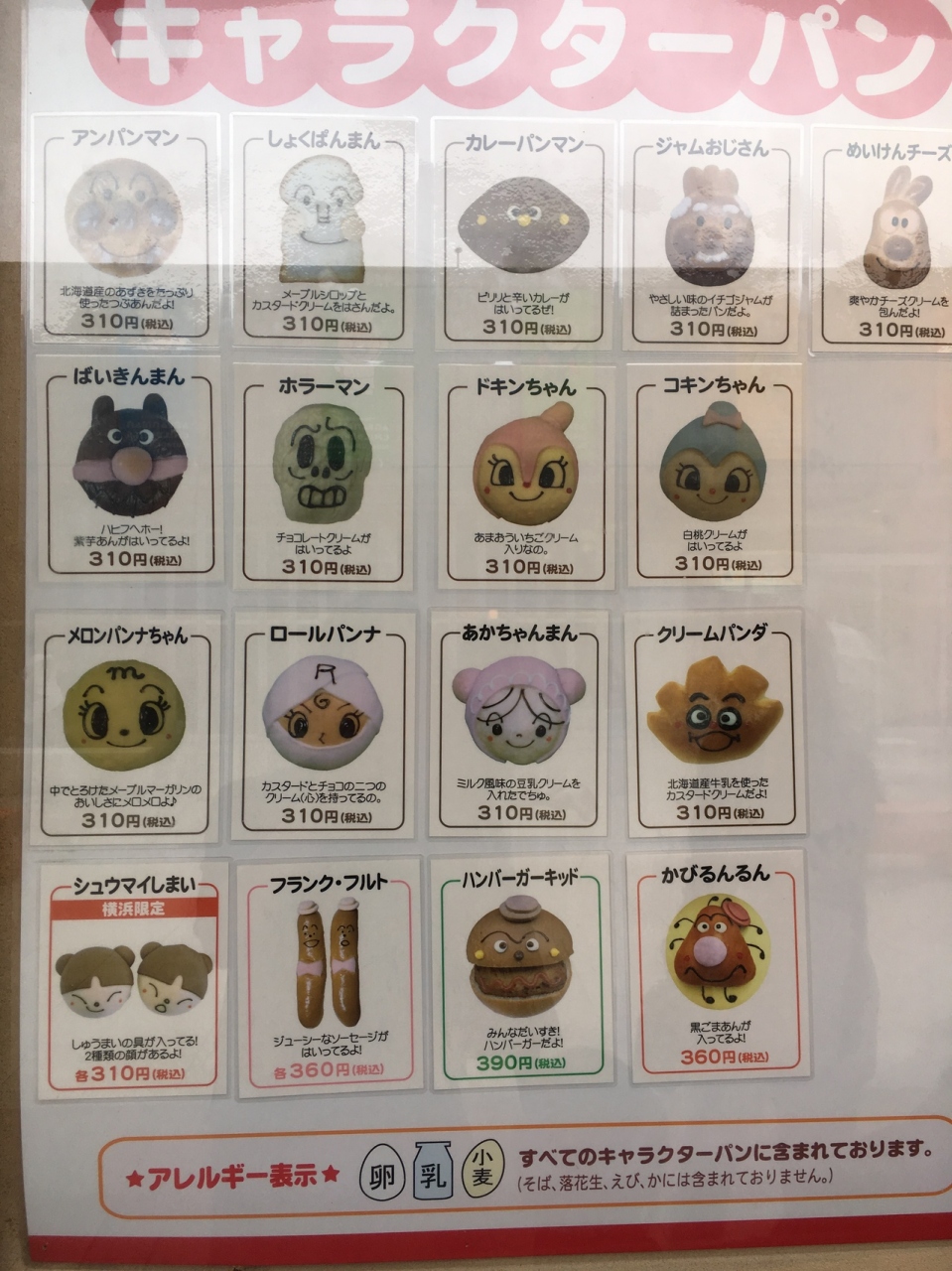 ひとつ300円ぐらいしますが、アンパンマンのキャラクターの形はどれも可愛らしく、クリームやジャムが入っていて、味もみんな違うので大人も一緒に楽しめるパンです。どのキャラクターのパンも可愛いくて、できれば全種類買いたかったです。