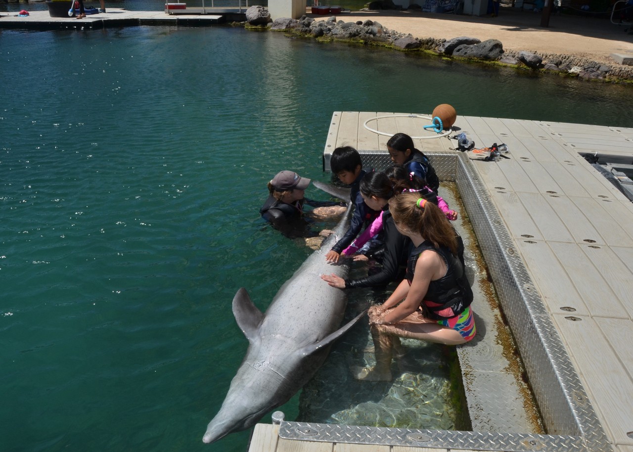 写真や実際の道具を使ってイルカの生態を教えてくれて、プールに入るとこれでもかというほどイルカに触らせてもらえます。