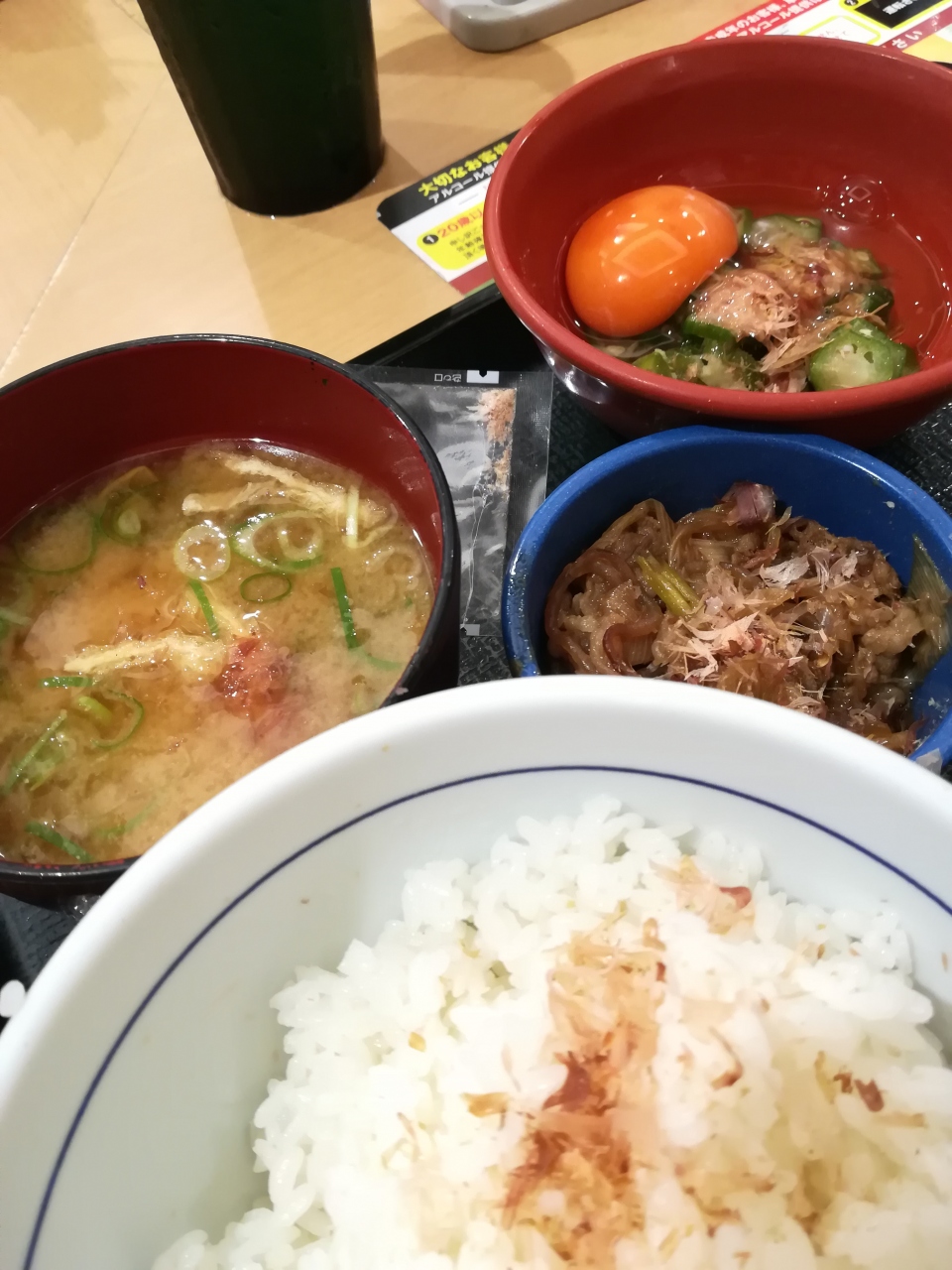 とても好きななか卯の朝食。ねばねばした感じが好きな人におすすめはオクラの朝食です。味噌汁と卵とオクラのハーモニーが楽しみめます。