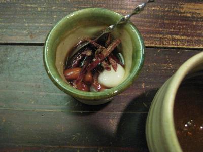 デザートの白玉のぜんざいには地元産の麦が入っていました。サービスで温か...