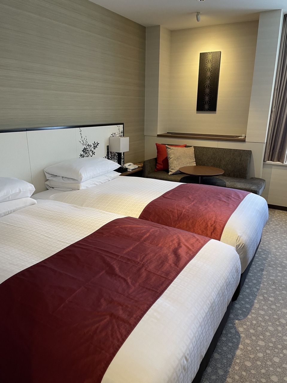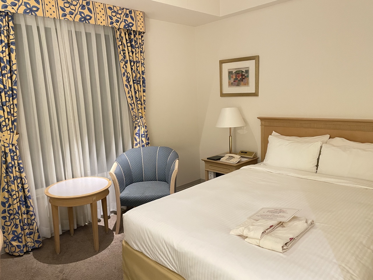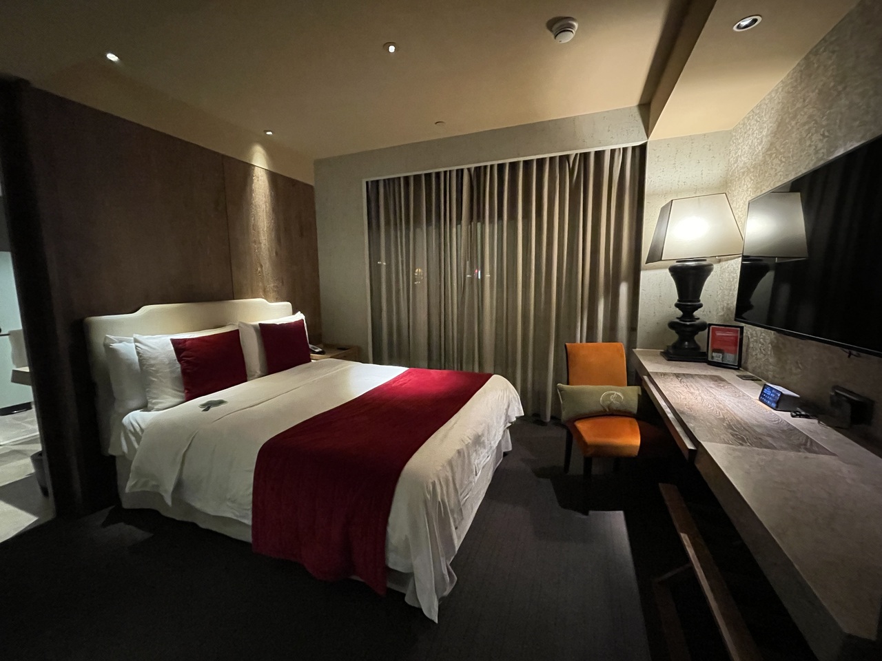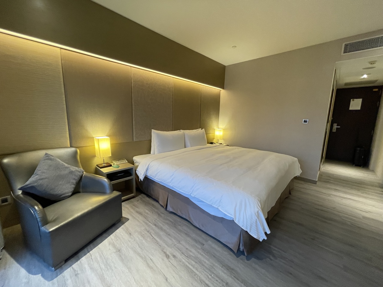 以前はフロントそばにドリンクブースがありましたが、コロナ禍の影響もあってか撤収されていたのは少し寂しかったです。部屋は1人でもゆったり過ごせる広さで、部屋全体がスッキリした印象です。サイズは小さいですが部屋からは台北101も見ることができました。- 旅行時期