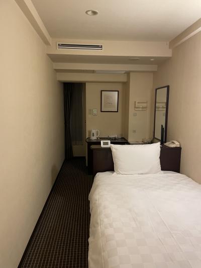 品川駅から徒歩3分もかからないホテル。イーストタワーに宿泊しました。シングルベッドと机、棚とミニマムなサイズ感のお部屋でした。(ハンガーもあり)