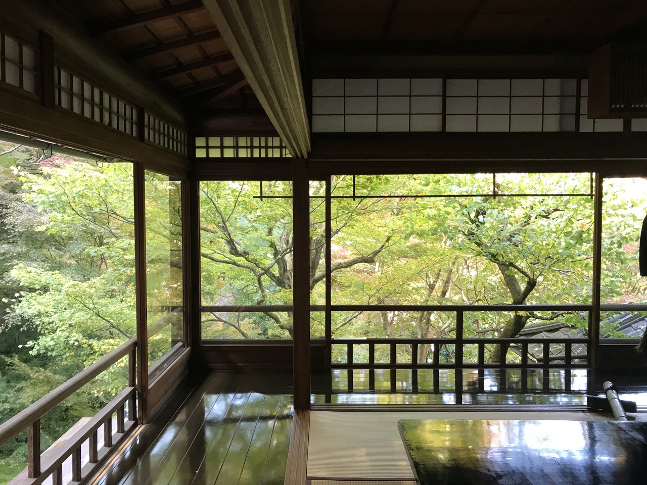 特別拝観期間中しか入ることにできないことと、テーブルや廊下にも新緑や紅葉が反射して映る美しさを一目見ようと、観光客がたくさん。