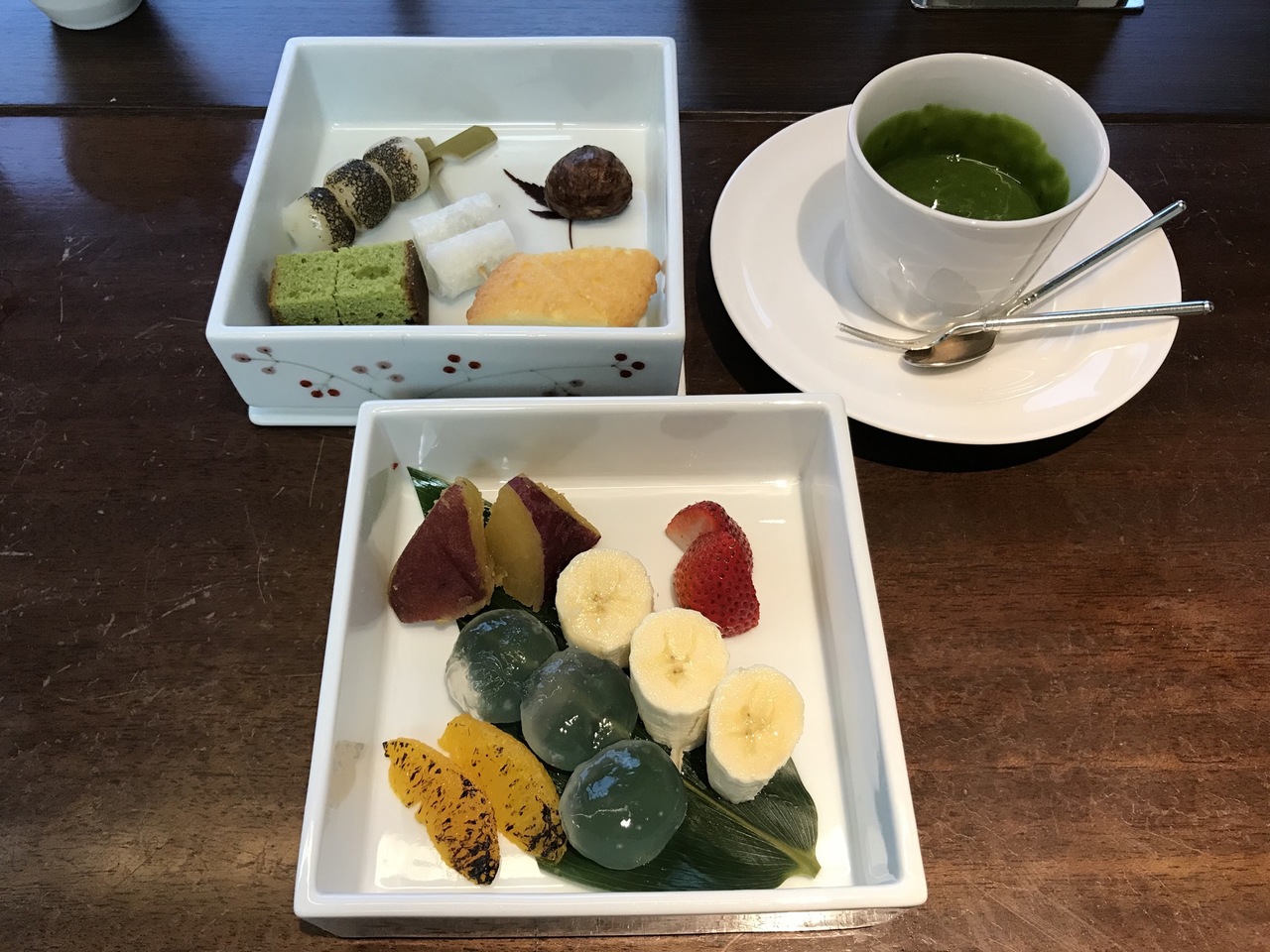 スクエアの陶磁器に入った焼き菓子やフルーツ、わらび餅?はそのまま食べても良いのでしょうが、私は迷うことなく抹茶にくぐらせて全部ペロリ。