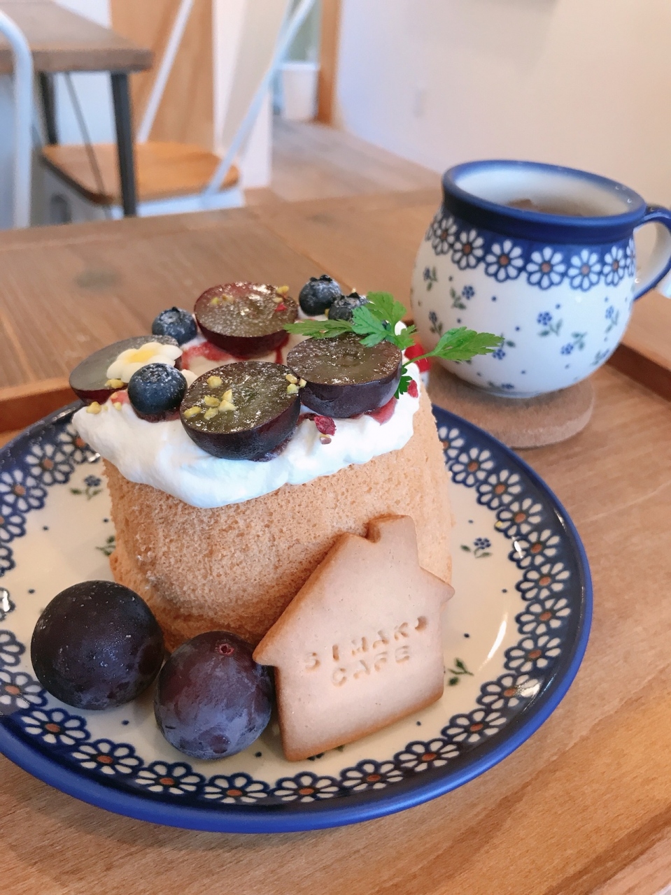 季節ごとに提供されるフルーツを飾ったシフォンケーキは可愛いの一言につきます。そして、シフォンケーキのそばに添えられた家型のクッキーもキュート。
