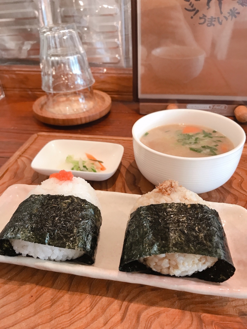 おにぎりはオーダーしてから握ってくれ、できたてホヤホヤ。味のよくしみた豚汁と一緒に食べるのがオススメです。- 旅行時期